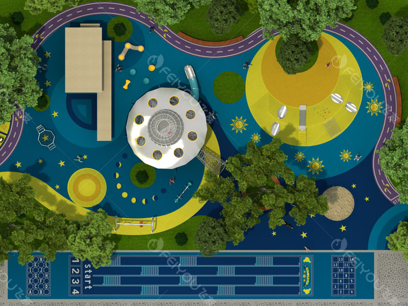 本設(shè)計以“UFO”造型鉆網(wǎng)為中心,輔以滑滑梯、秋千、蹦床、微地形,培養(yǎng)幼兒鉆、爬、滑、晃等能力,為幼兒打造全方位的游戲體驗