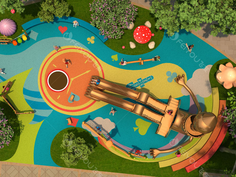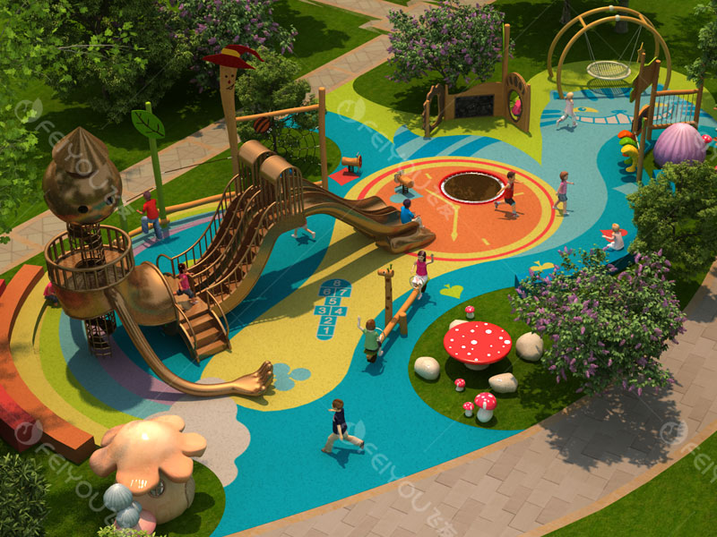 本設(shè)計(jì)以“銅人”造型滑梯為中心,輔以鳥巢秋千、蘑菇小屋、告示牌等造型玩具,培養(yǎng)幼兒鉆、爬、滑、晃等能力,為幼兒提供全方位的游戲體驗(yàn)