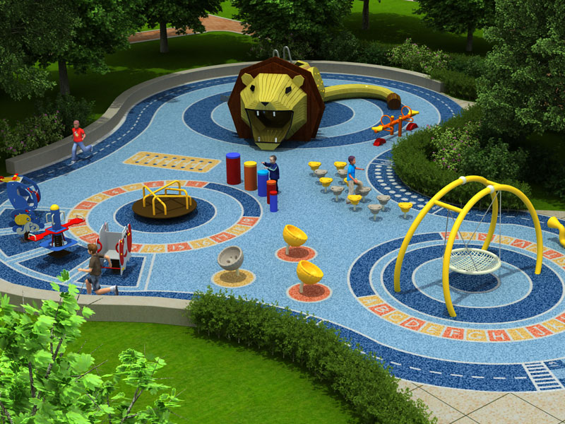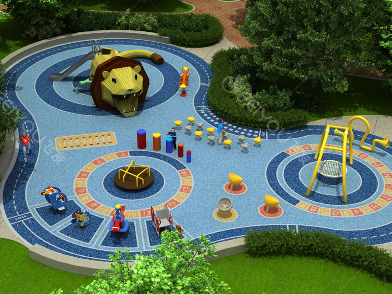 本設(shè)計以“獅子”造型為中心,輔以鳥巢秋千、傳聲筒、打擊樂器、拍鼓、搖搖樂、蹺蹺板等造型玩具,鍛煉兒童四肢的平衡發(fā)展,培養(yǎng)幼兒鉆、爬、滑、搖、拍、聽、音等能力。
