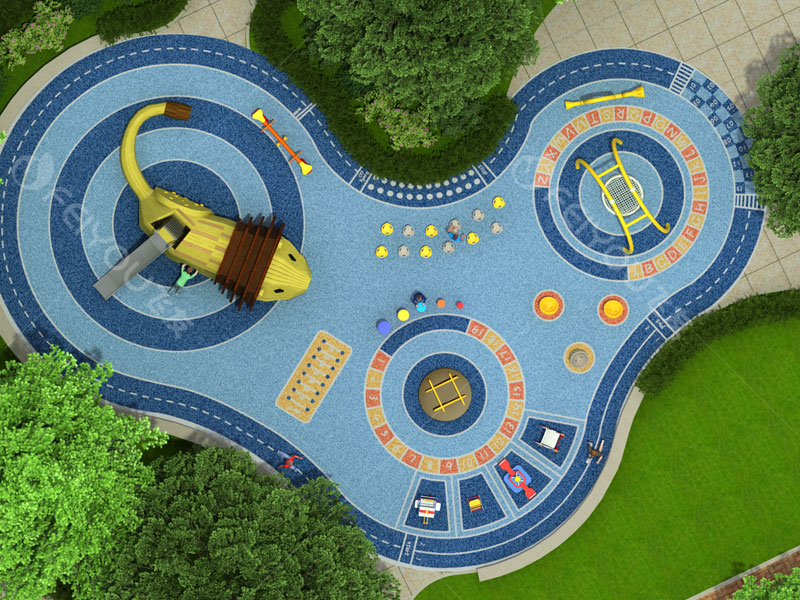 輔以鳥巢秋千、傳聲筒、打擊樂器、拍鼓、搖搖樂、蹺蹺板等造型玩具,鍛煉兒童四肢的平衡發(fā)展,培養(yǎng)幼兒鉆、爬、滑、搖、拍、聽、音等能力。