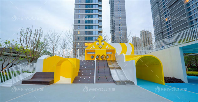 城市住宅區(qū)一般位于黃金地段,如何充分利用社區(qū)公共空間是設計的難題。在水平空間有限的住宅區(qū)里,設計師應充分利用游樂區(qū)的垂直空間。例如,在盆地布局的幫助下,利用高差,在斜坡上設置滑梯、攀巖架、攀巖墻等,在盆地底部設置沙池、蹦床等設施。