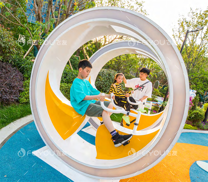 住宅區(qū)內(nèi)的游樂區(qū)是一個公共娛樂場所,需要考慮不同年齡段居民的需求,社區(qū)居民的年齡結(jié)構相對復雜,因此在游樂區(qū)設計中,應結(jié)合健身器材、戶外組合滑梯、感統(tǒng)搖樂,以滿足社區(qū)各年齡段居民的需求,提高社區(qū)居民日常娛樂、鍛煉方式的豐富性。