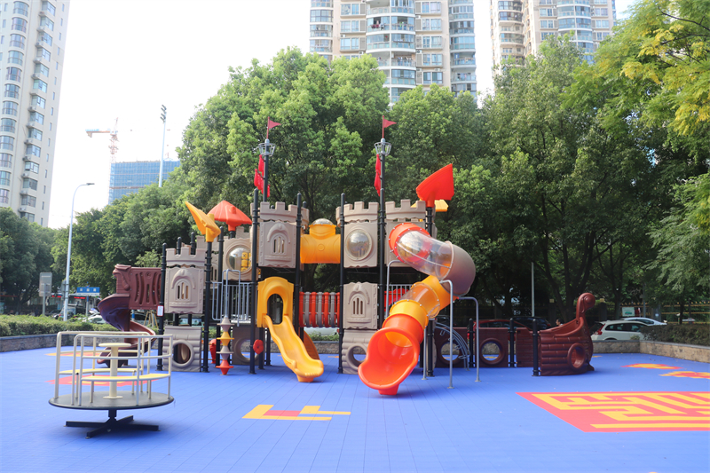 植入原生自然元素,讓趣味與生態(tài)共生。將石材、木材、沙土、水體等自然材料轉(zhuǎn)化為游樂載體,是提升趣味性的關(guān)鍵。可設計“自然探索區(qū)”,用鵝卵石鋪設平衡步道,不同形狀的鵝卵石帶來多樣觸感,鍛煉孩子平衡能力;設置沙水互動區(qū),采用天然細沙搭配循環(huán)水景,孩子們可堆砌沙堡、搭建水渠,在玩水玩沙的過程中探索水流動力與沙土可塑性。此外,還可在設施周邊種植本土花草灌木,打造“植物認知角”,標注植物名稱與特性,讓孩子在游樂間隙觀察花草生長、昆蟲活動,實現(xiàn)趣味玩樂與自然認知的雙重收獲。